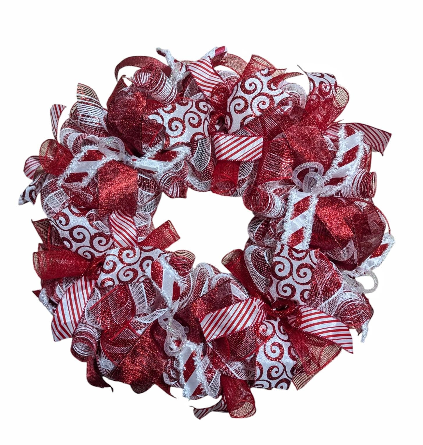 Fresh cool minty freshness is blasting throughout this wreath! Created on a shimmer red and white check base, this wreath holds twists is red and white mesh and laser stripe and has ribbons in mints, snowdrifts, stripes and chevrons and is finished with loops if metallic shimmer deco tubing. Bring your hot chocolate as you welcome your guests with this minty door decor piece!