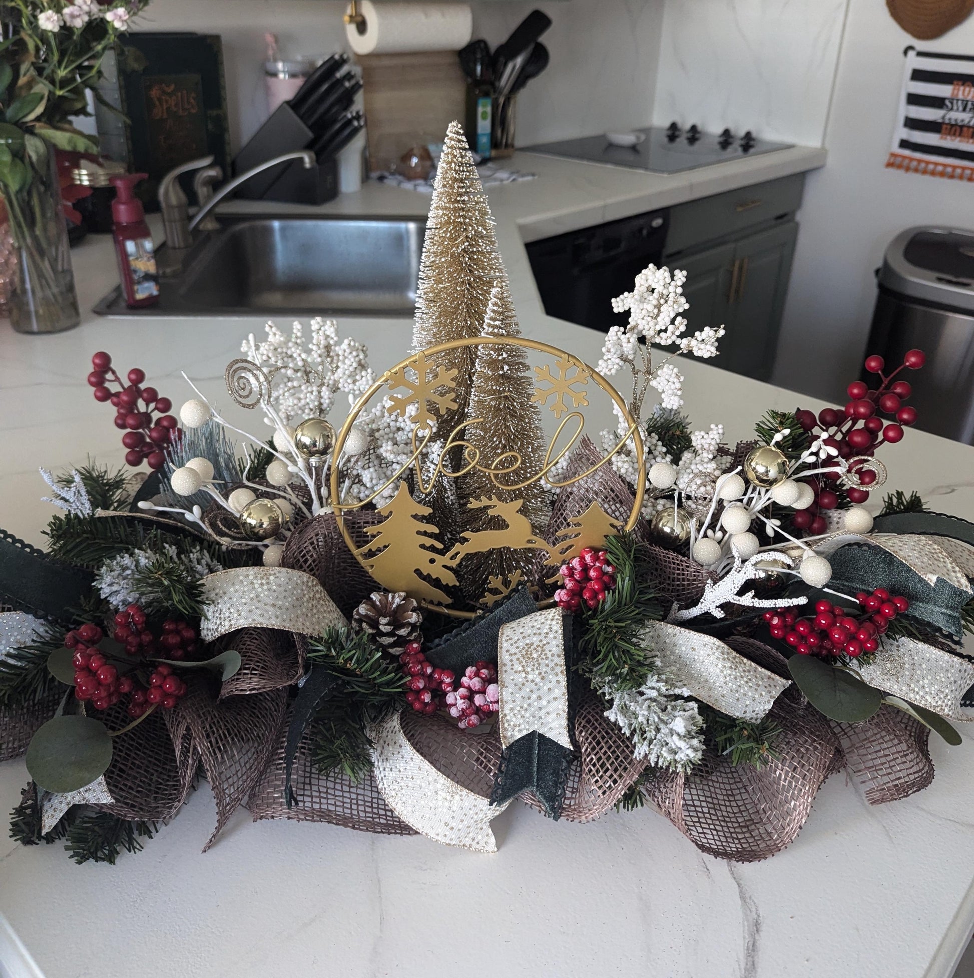 This 30" x 10" gold white red and green Woodland "Noel" centerpiece is one of a kind and will be a beautiful addition to your dinner table or mantle this holiday season! Created on a pine form this piece is filled with a variety of velvet emerald and white with gold dot ribbons along with lit gold trees, a golden reindeer bowl sign surrounded by berry and snow picks! Don't miss out on this one of a kind item to add to your Christmas decor this holiday season! (Batteries are included)