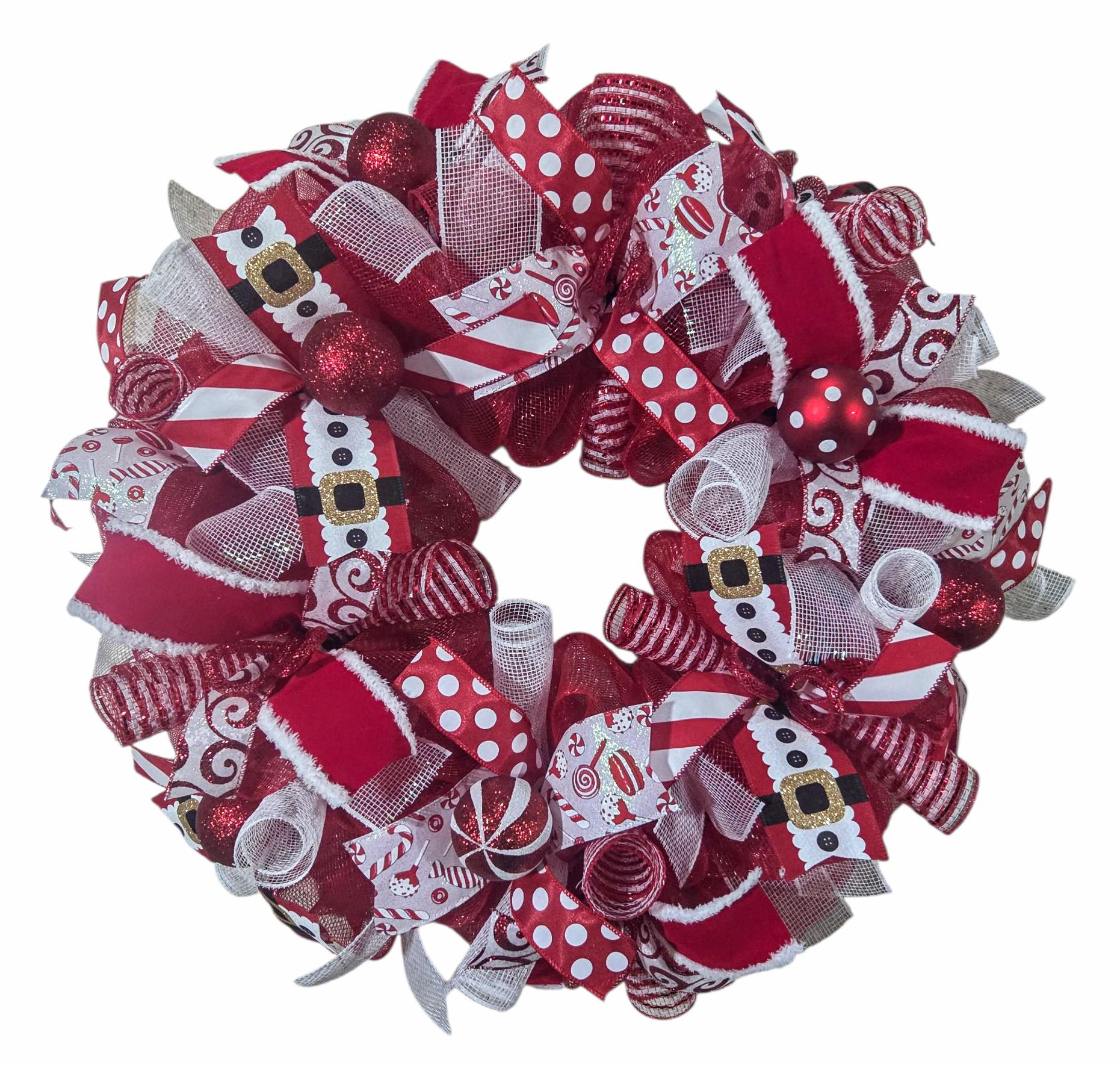 This 24 x 8" fun and whimsical Christmas wreath was created on a red mesh base and holds twists of red and foil mesh. In this item you will find a variety of fun Christmas Colors and patterns with materials and quality built to last!