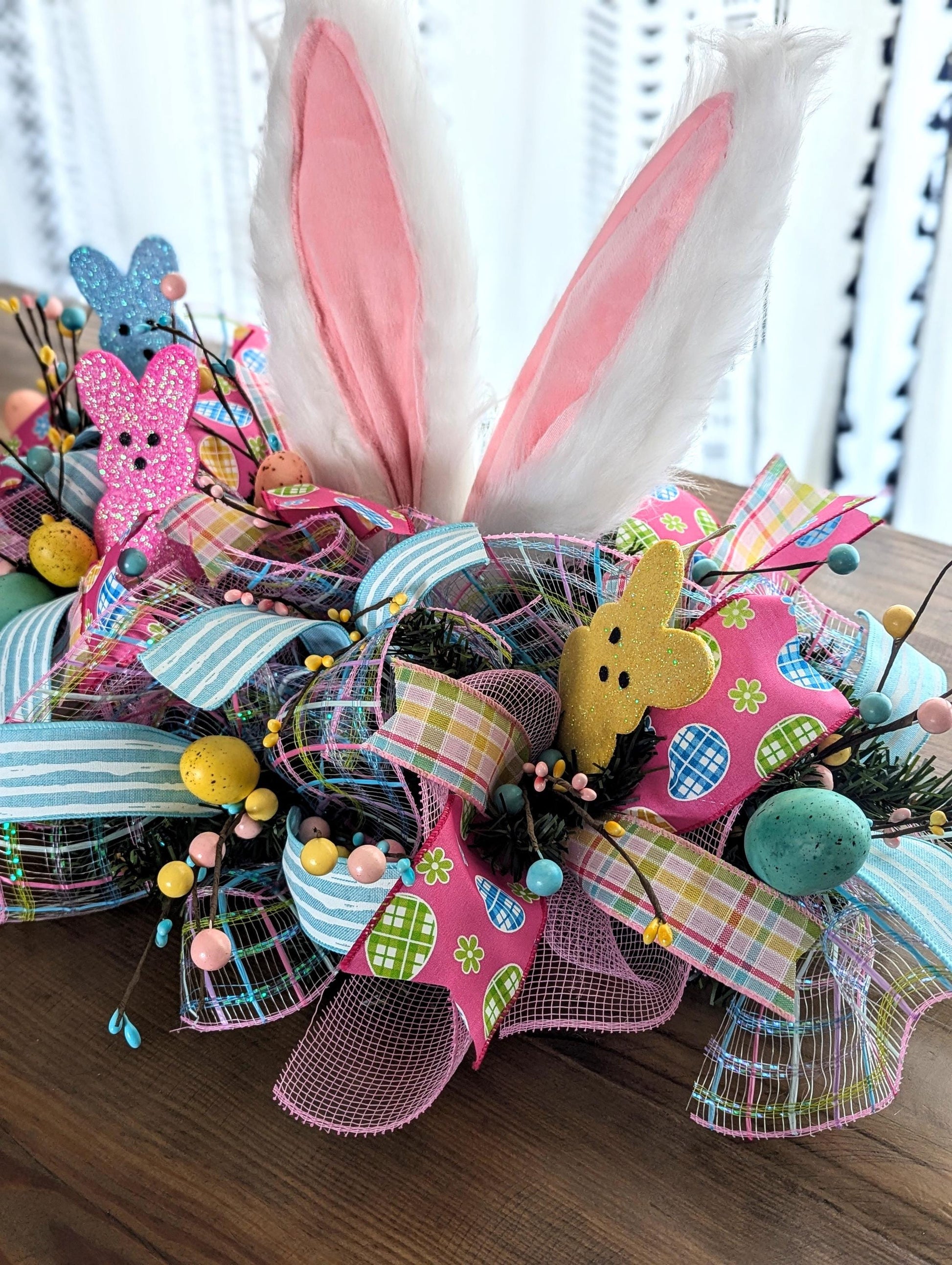 This cute 24" Easter centerpiece was created on a pine base and hold ruffles in pink and pastel plaid. Inside this item you will find eggs and peeps along with color coordinated Easter ribbons. With bendable ears to prop this as your own, this one of a kind centerpiece is sure to take the stage at your family dinner!