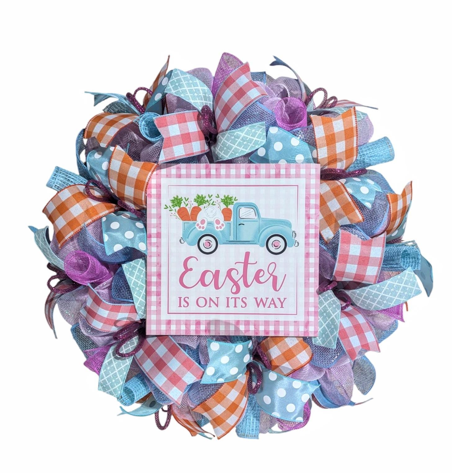 Created on a pink base, this 24" x 8" wreath holds twists in pink and turquoise. This wreath is covered in color coordinating plaids and polka dots and is highlighted with hot pink mesh tubing! Welcome guests this Easter with this show stopping door decor item!