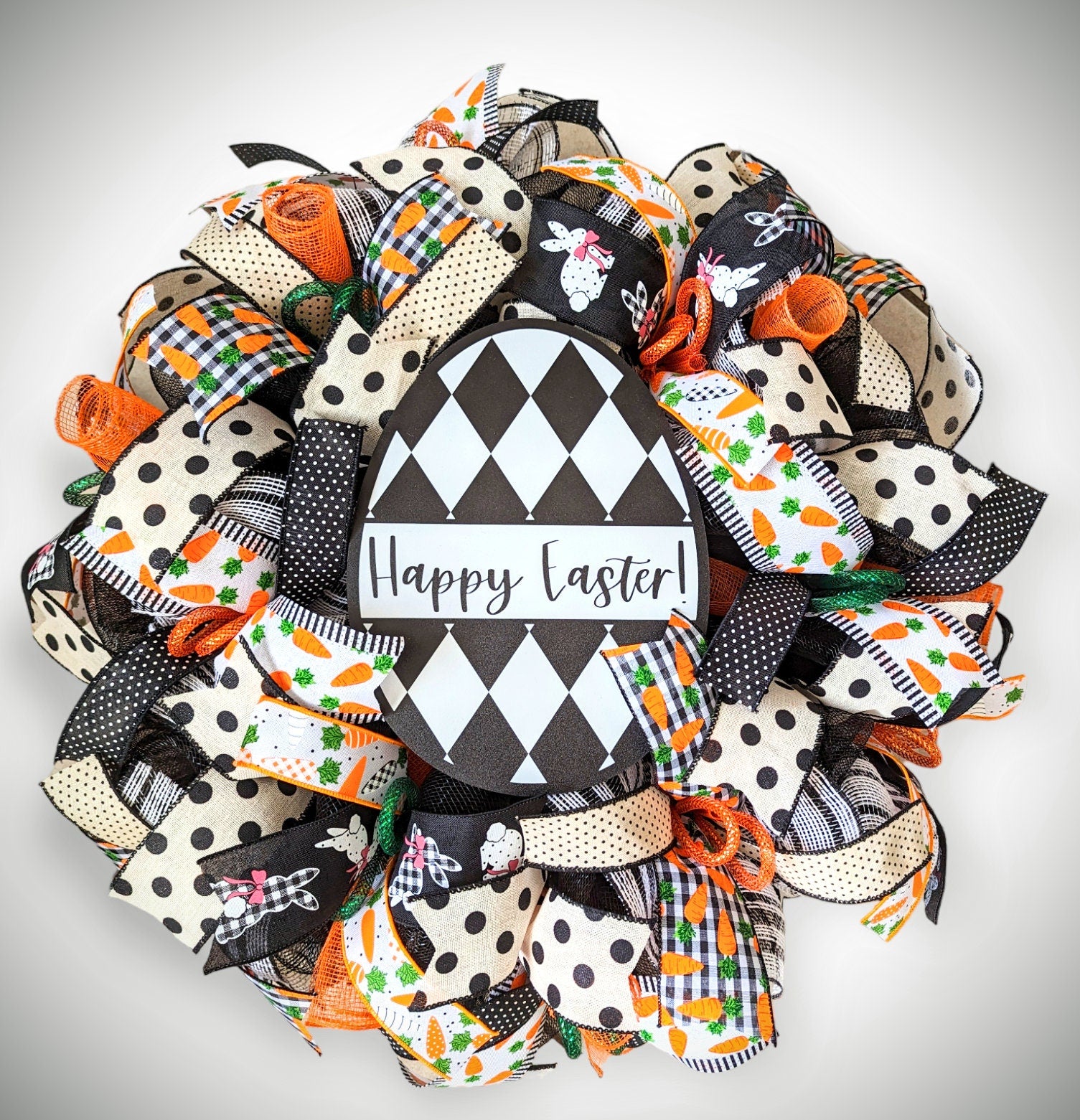 Created on a black mesh base, this carrot inspired wreath measures at 24" x 8" and holds ruffles in orange mesh and black white check. Keeping up with the trends and adding a little "mod" to your door, this piece is the perfect decor item to welcome your guests this Easter celebration holiday!