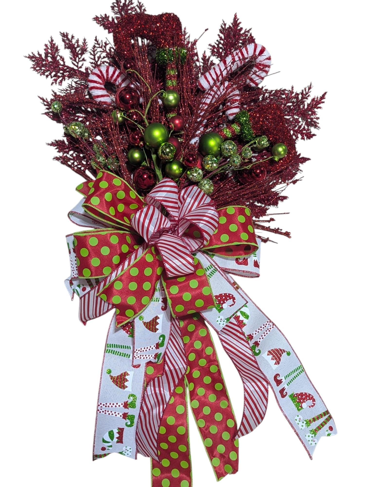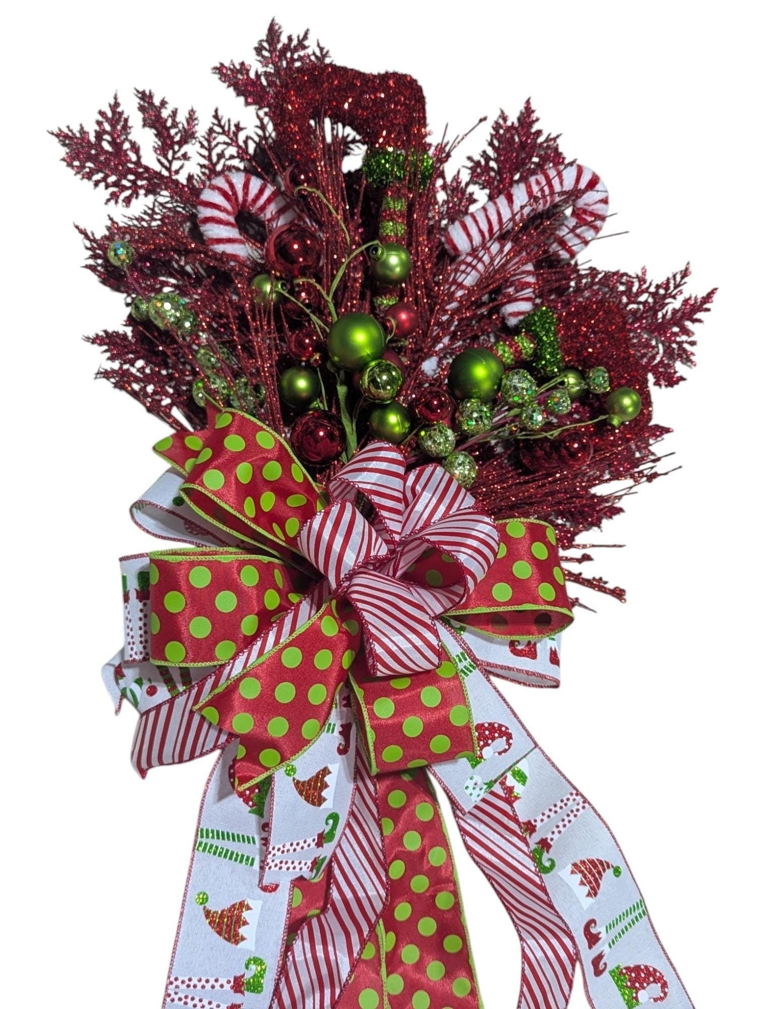 Christmas tree topper easy to install! Crated with a variety of ribbons affixed to a variety of candy cane sprays, this 24" *12" tree topper slides right into the top of your tree!