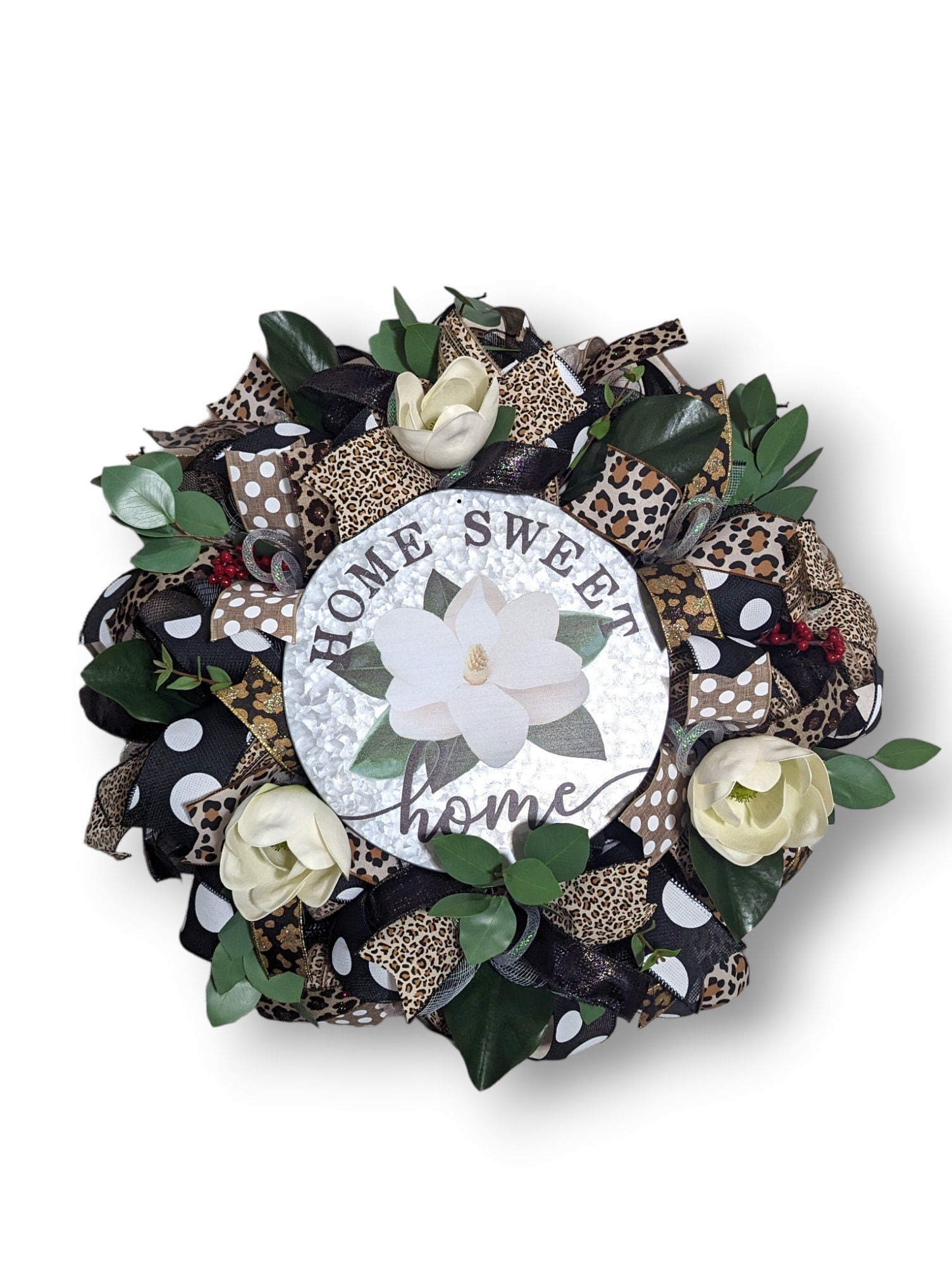 Created on a black mesh base, this 24" x 8" wreath hold ruffles in black and white check mesh along with a jute leopard trim mesh. This wreath is covered in magnolias, greenery, polka dots a leopard prints along with white deco flex tubing accents. This everyday welcome wreath is ready "welcome" your guest for months to come!