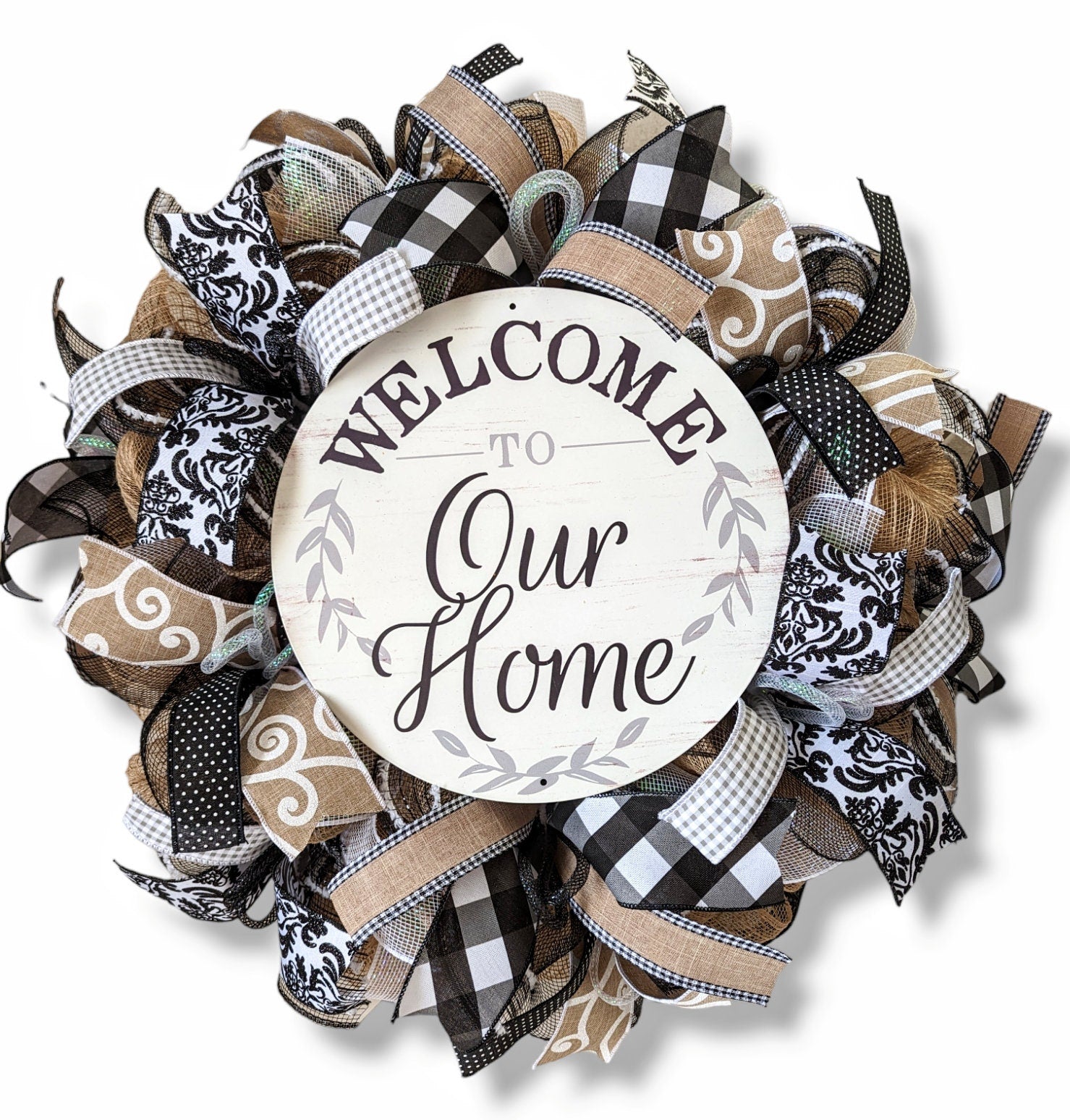 Created on a jute mesh base, this 24" x 8" wreath hold ruffles in black and cotton drift mesh with white mesh ribbon and black and white deco flex tubing accents. This everyday welcome wreath is decorated in a variety of black and white, tan and greys and is ready to "welcome" your guest for months to come!