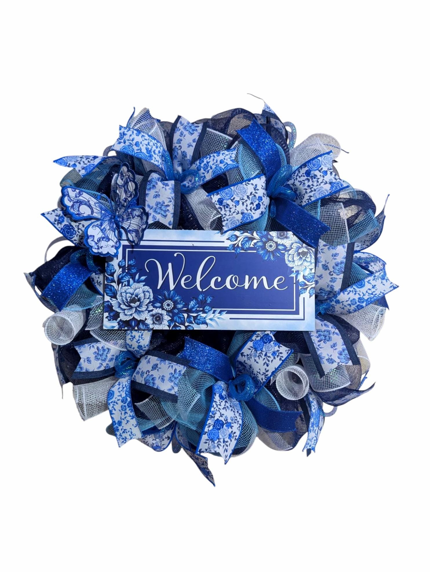 Created on a Navy blue base, this 24" x 8" wreath hold ruffles and twists in bright blue and white. Perfect for everyday on your door, this wreath is covered in floral print blue themed color corrdinated ribbons! Welcome guests all spring and summer long with this show stopping door decor items!