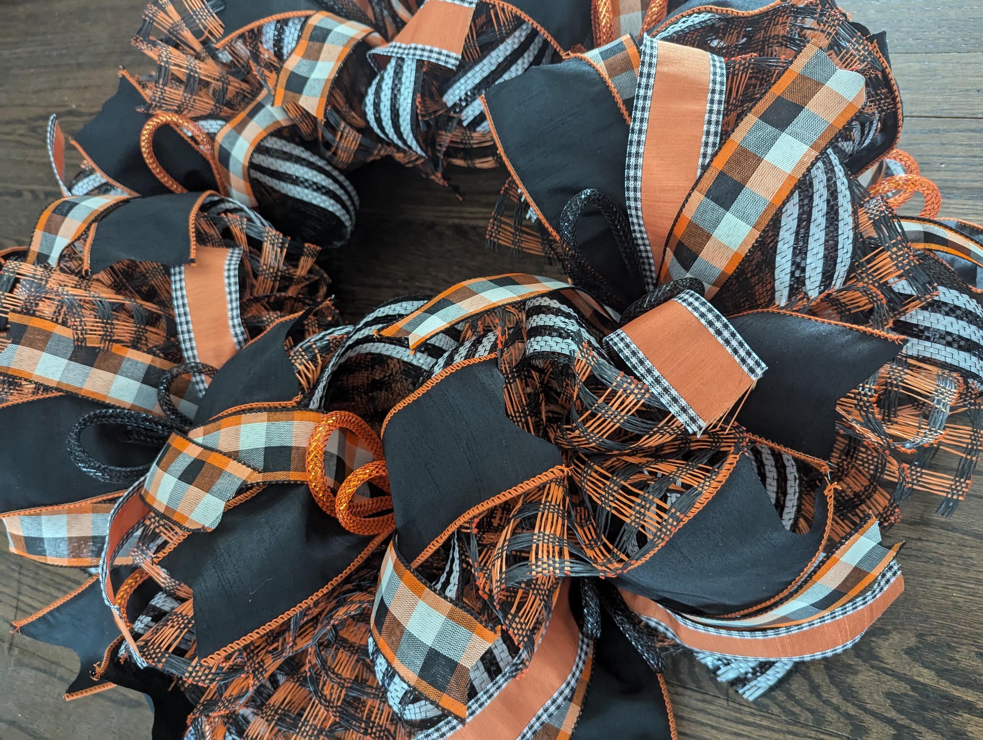 Welcome your guests this fall with this full and flowing ruffle wreath! Created with layers of black and orange window pane jute mesh and a black and white striped mesh, this piece is layered to last. Inside this wreath you will find ribbons and plaids salads and checkered edges. You also find loops of coordinating colored tubing surrounding this Buffalo plaid welcome sign letting everyone at your door know they reached your corner of the neighborhood.