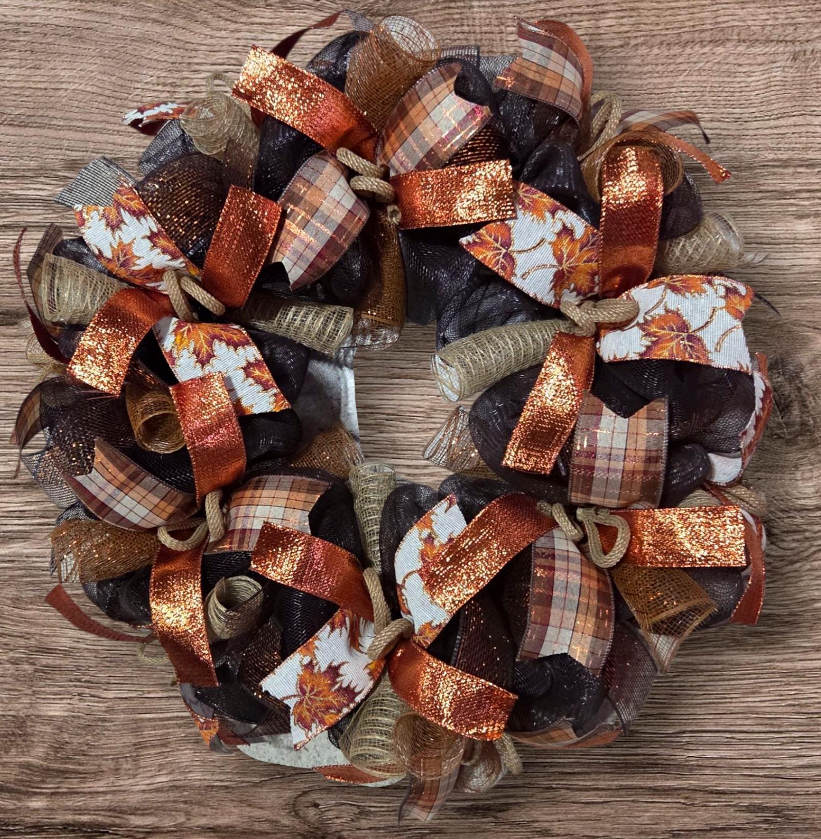 Setting off this wreath are ribbons full of fall colors in plaids, leaves and shimmering accents!
