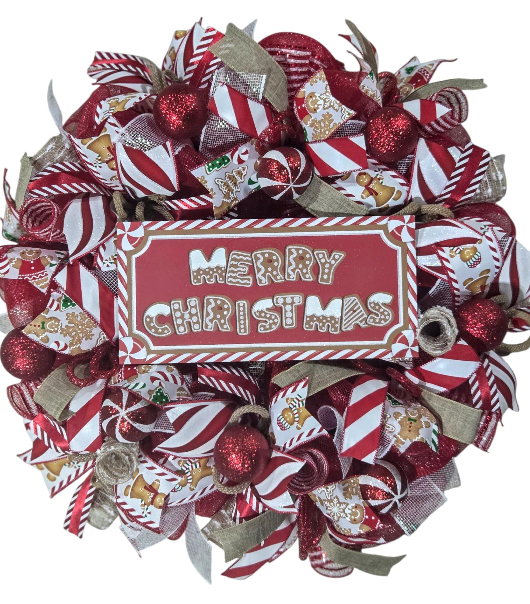 Warm gingerbreads and cool minty freshness is blasting throughout this wreath! Created on a red base, this wreath holds twists is red and white mesh and laser stripe. This item has ribbons in variety of breath cooling ribbons and warm gingerbread men and is finished with loops if metallic shimmer deco tubing and ornaments. Bring your hot chocolate as you welcome your guests with this minty door decor piece!