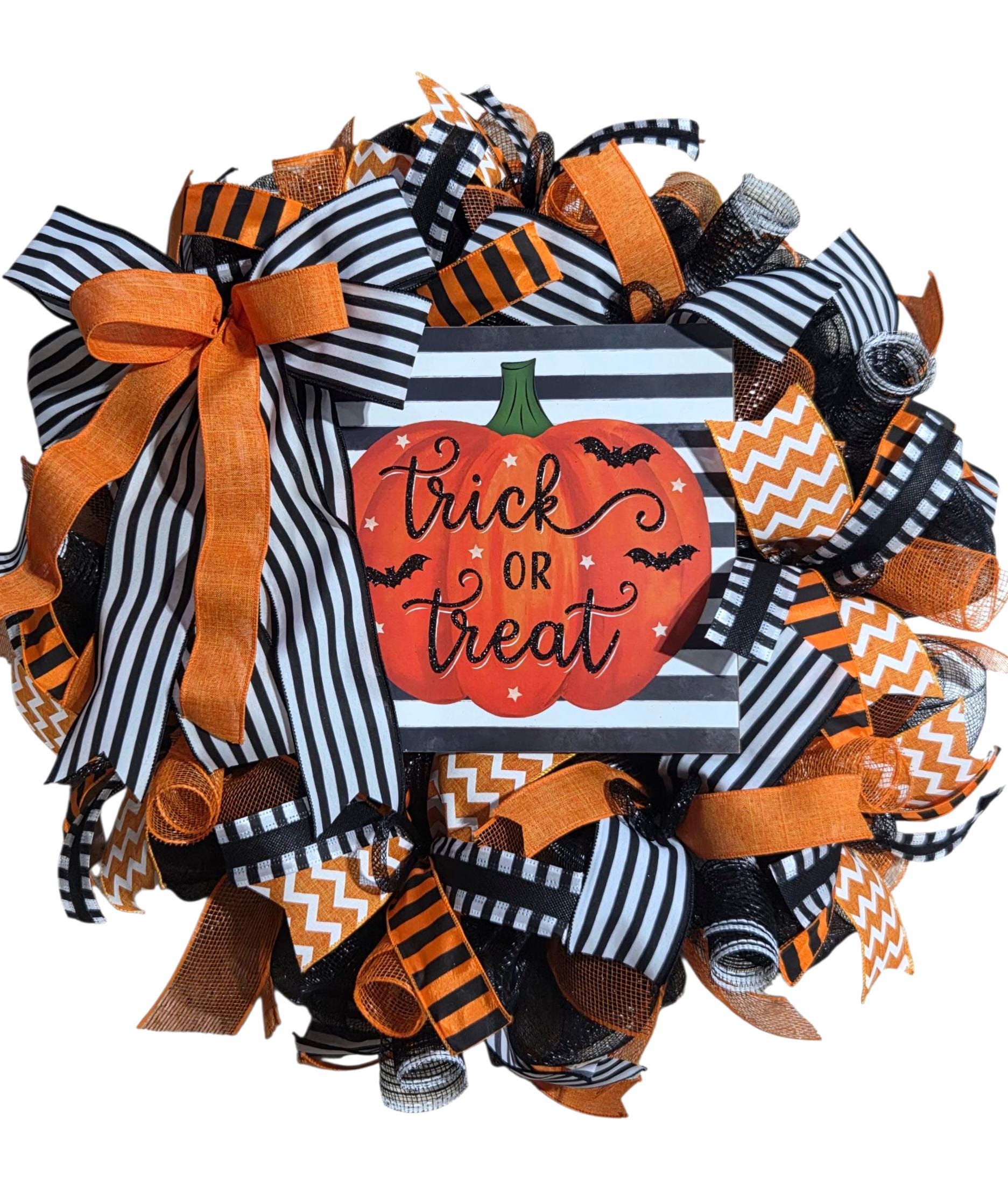 Make sure those kiddos know to say "trick or treat" this halloween season! This wreath was created on a black mesh base and is covered in a variety of twists of black and white jute stripe mesh and orange. In this item you will find stripes, solids and chevrons surrounded by loops of tubing. This item is sure to be the final touch to your halloween porch decor!