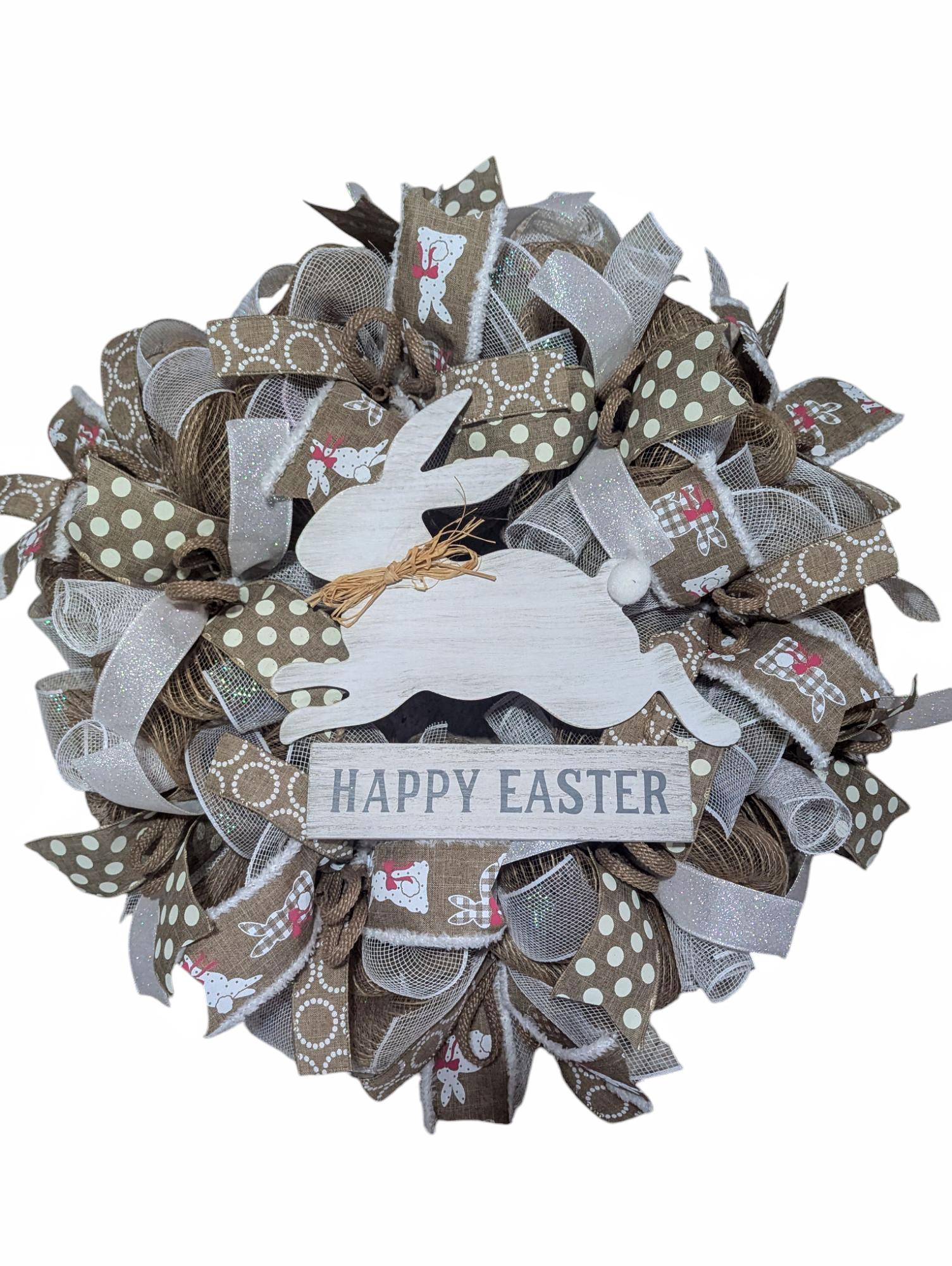 This 24 x 8 Happy Easter Bunny wreath was created on a jute base with twists of white and ruffles of jute mesh. Topping off this item are fun Easter themed coordinating ribbons! You will also find loops of tubing through this piece giving your door or decor wall a "hop" into easter!