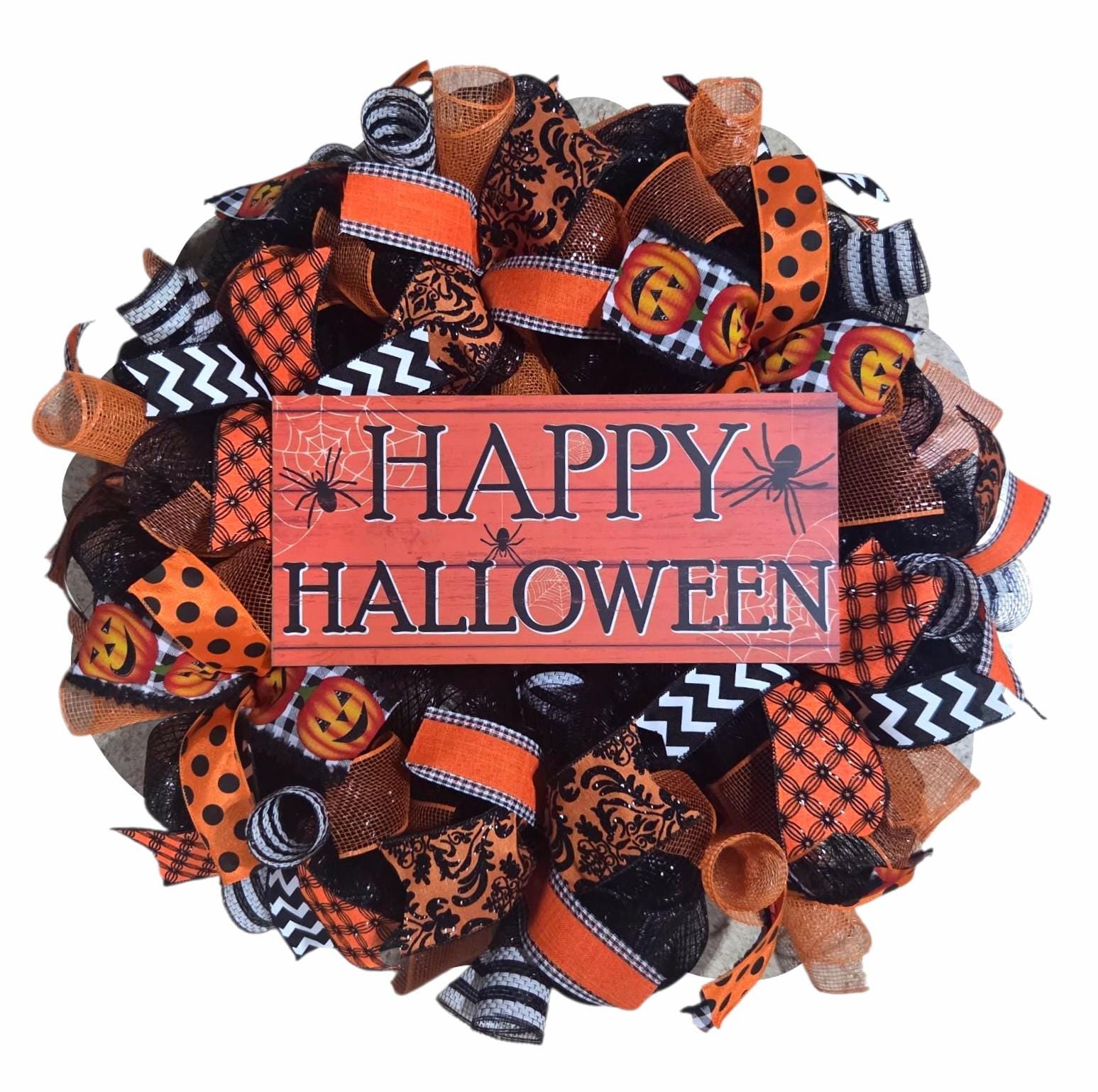 HAVE YOU WELCOMED YOUR GUESTS TO YOUR HAUNTED HOME THIS SPOOKY SEASON? CREATED ON A BLACK DECO MESH BASE, THIS ITEM IS ALSO COVERED IN TWISTS OF ORANGE AND RUFFLES OF ORANGE WITH BLACK TRI STRIPE MESH. WITHIN THIS 24x 8 HAPPY HALLOWEEN PIECE, IS A VARIETY OF COLOR COORDINATED RIBBONS IN STRIPES, HARLEQUIN AND A FESTIVE "BOO" RIBBON, LEAVING ALL YOUR GUESTS FEELING FESTIVE THIS HALLOWEEN!
