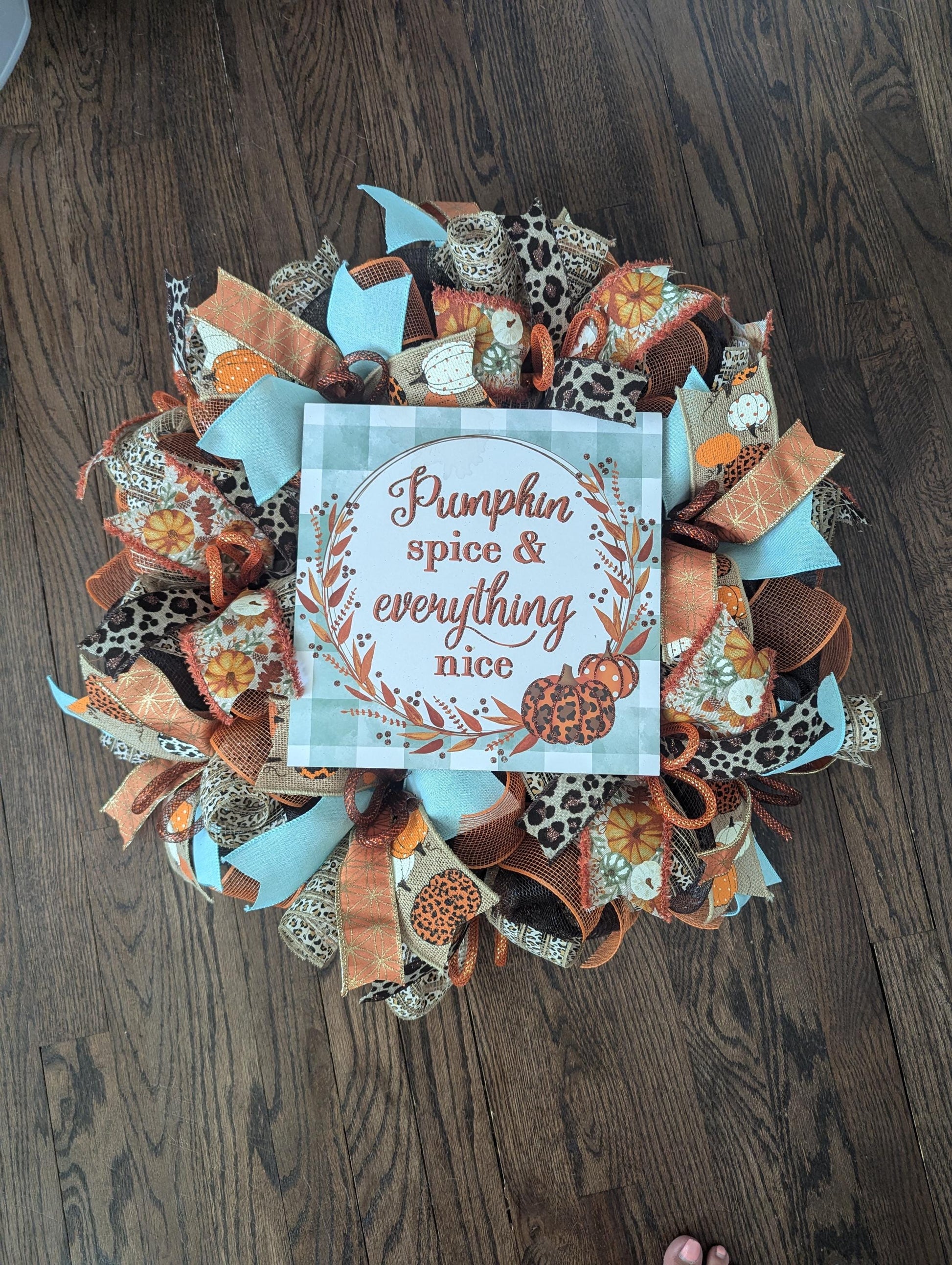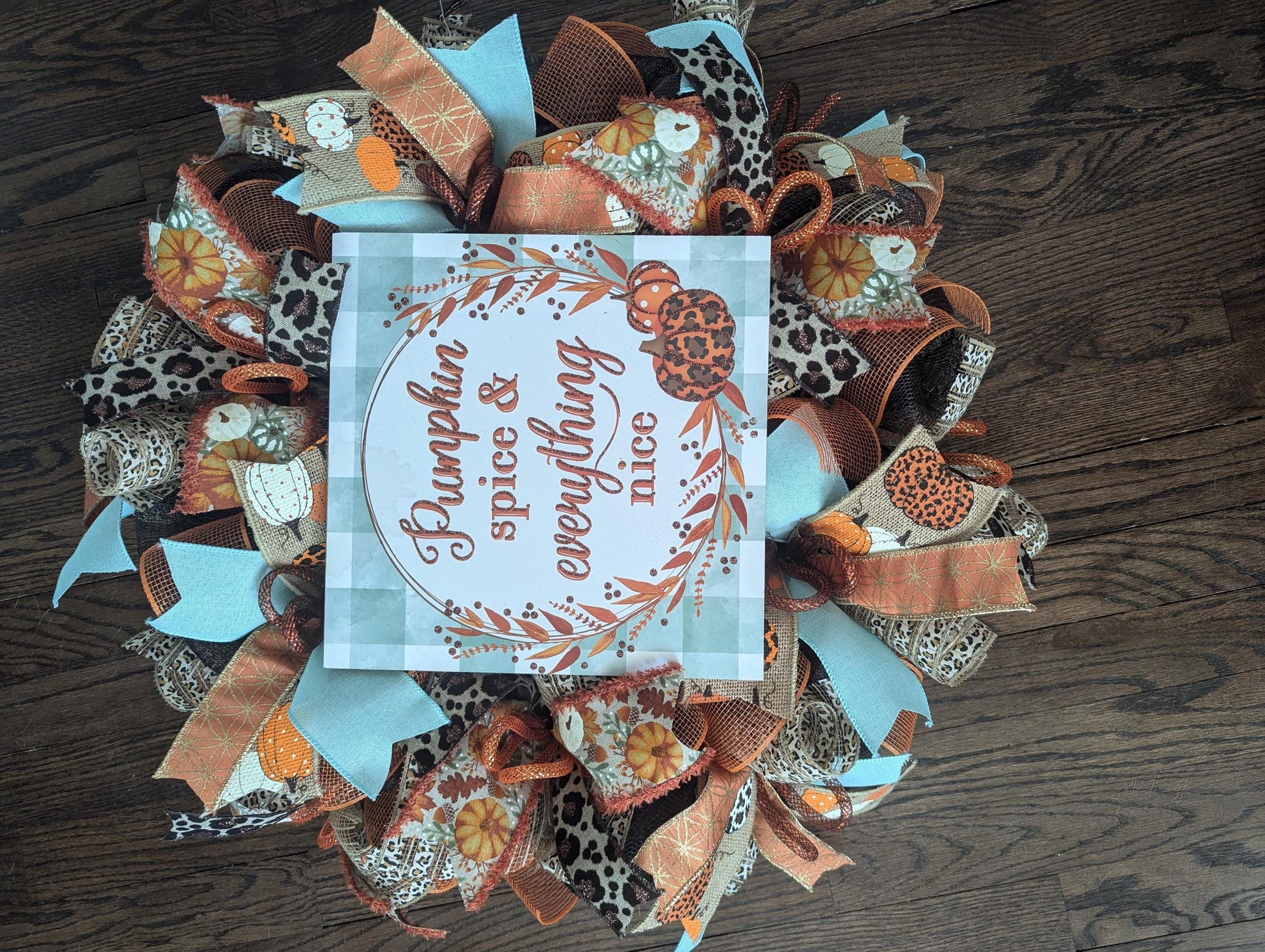 Setting off this wreath are ribbons full of fall colors in pumpkins and leopard print! You will also find loops of chocolate and orange tubing centering the fall themed ribbons with pops of mint.