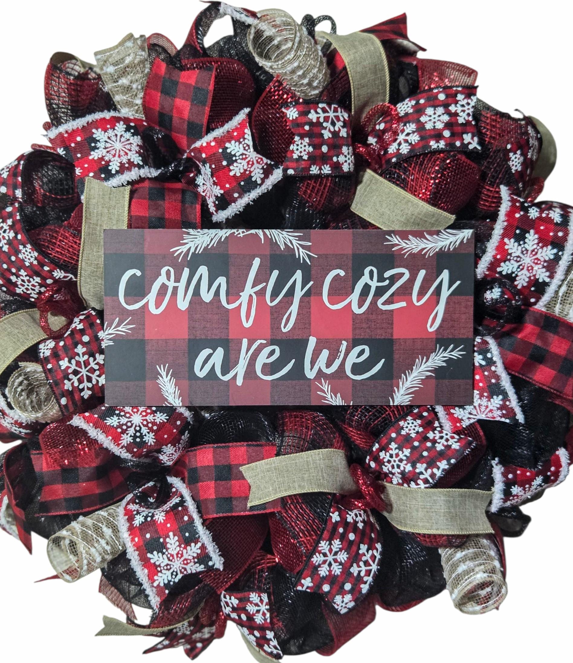 This 24 x 8" warm and Icy inspired wreath was created on a black base and holds ruffles in red and black plaid and twists of snow jute. In this item you will find glistening snowflakes and coordinating ribbons in buffalo plaids and snowflakes! This wreath is sure to give a warm welcome on those chilly winter days!