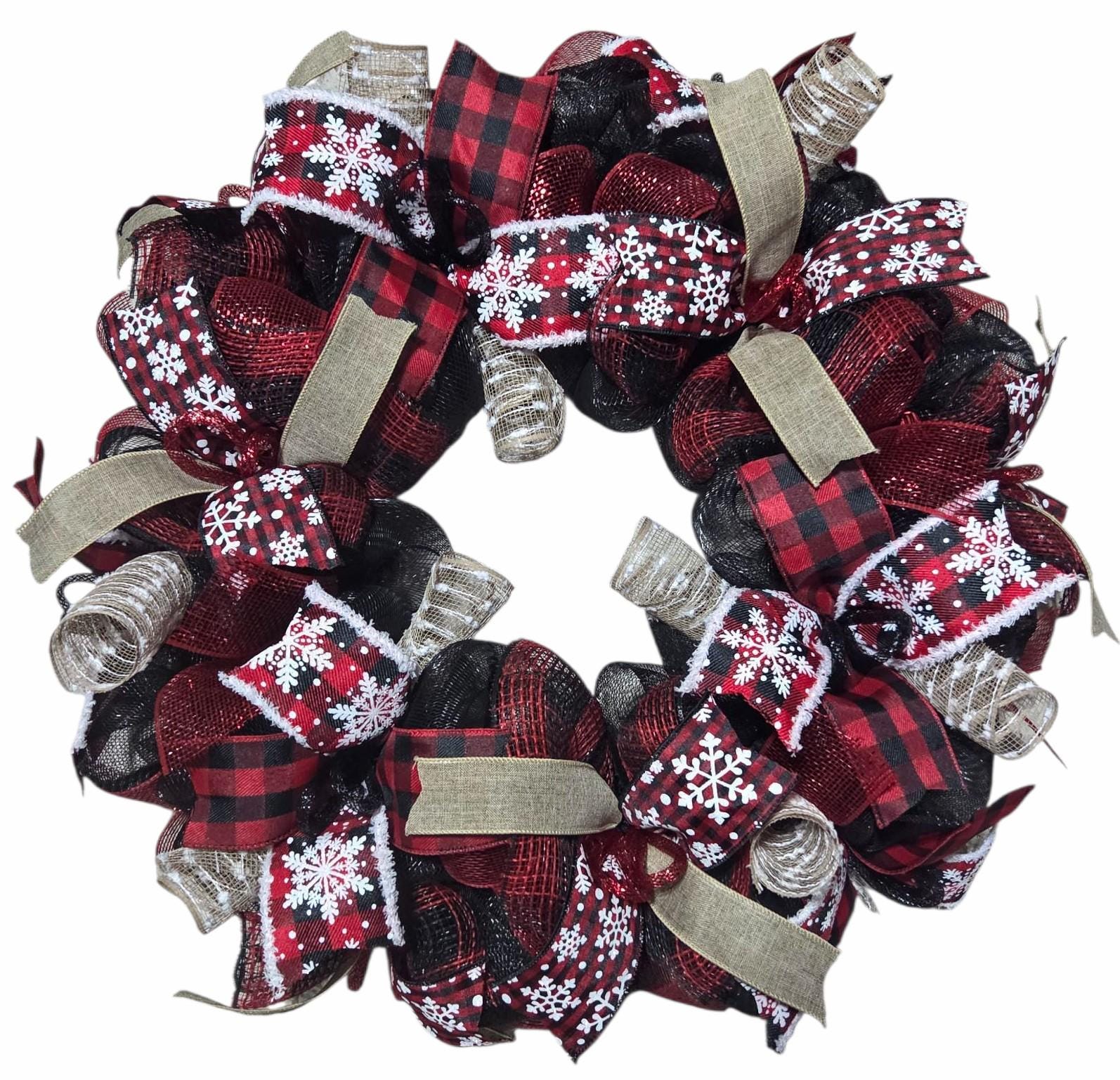 This 24 x 8" warm and Icy inspired wreath was created on a black base and holds ruffles in red and black plaid and twists of snow jute. In this item you will find glistening snowflakes and coordinating ribbons in buffalo plaids and snowflakes! This wreath is sure to give a warm welcome on those chilly winter days!