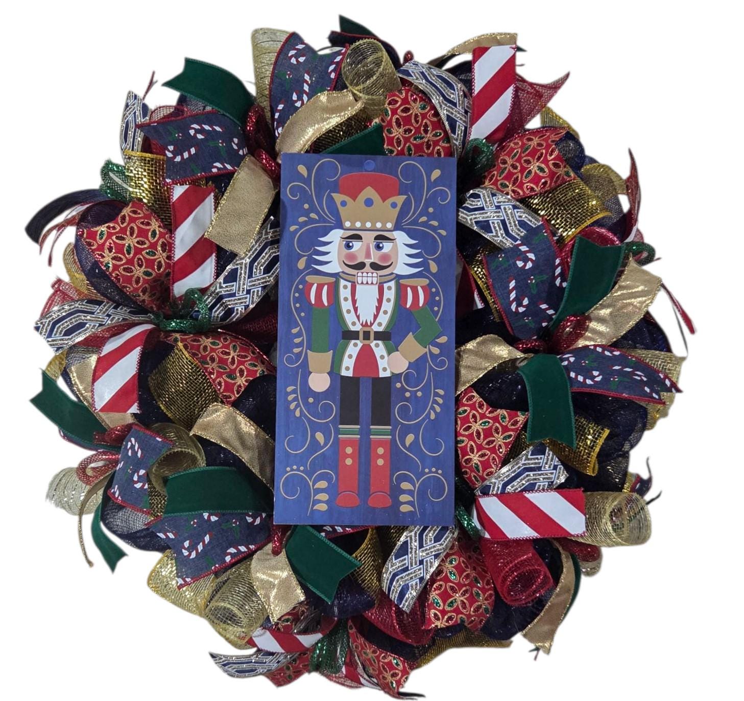 This 24x8" classic nutcracker wreath was created on a navy base and holds twists is red and green mesh with gold accent mesh. This Christmas piece holds ribbons in variety of elegant glitters, Candy stripes and is finished with loops if metallic shimmer deco tubing and ornaments. No need to pay those big ticket prices with The Nutcracker right at your door!