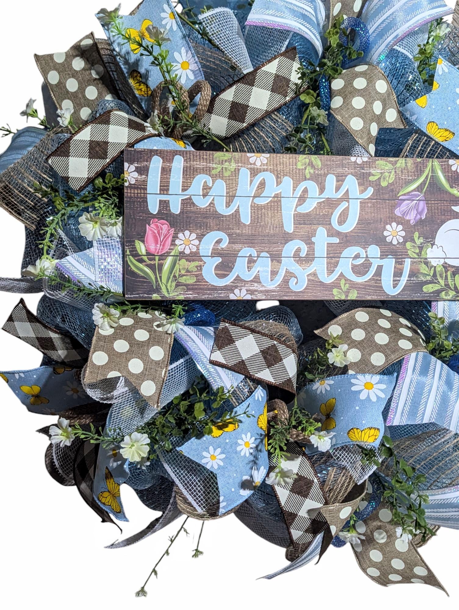This 24 x 8 Happy Easter Bunny wreath was created on a blue base with twists of white and ruffles of jute mesh. Topping off this item are fun Easter themed coordinating ribbons! You will also find loops of tubing through this piece giving your door or decor wall a "hop" into easter!