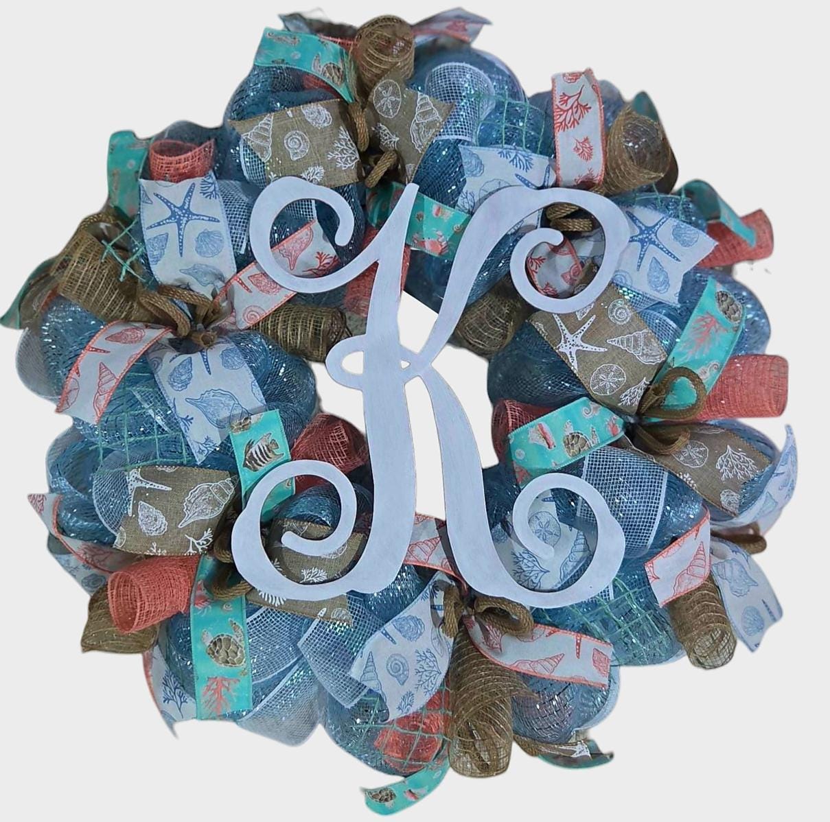 This seaside summer wreath was created on a blue deco mesh base and holds twists of jute and coral. Covered in seaside themed ribbons you will also find loops of metallic tubing surrounding this item, ready to welcome your guests this whole summer season!