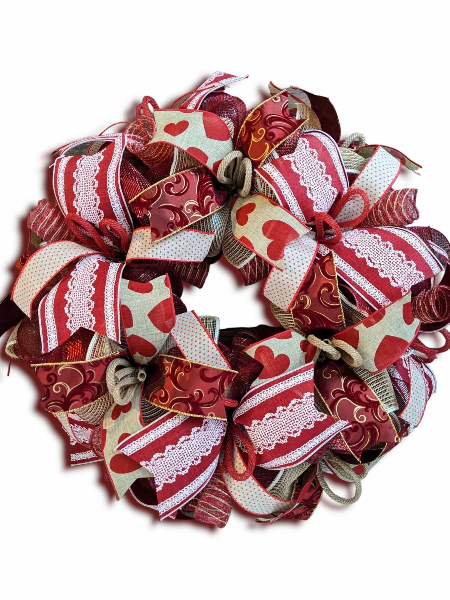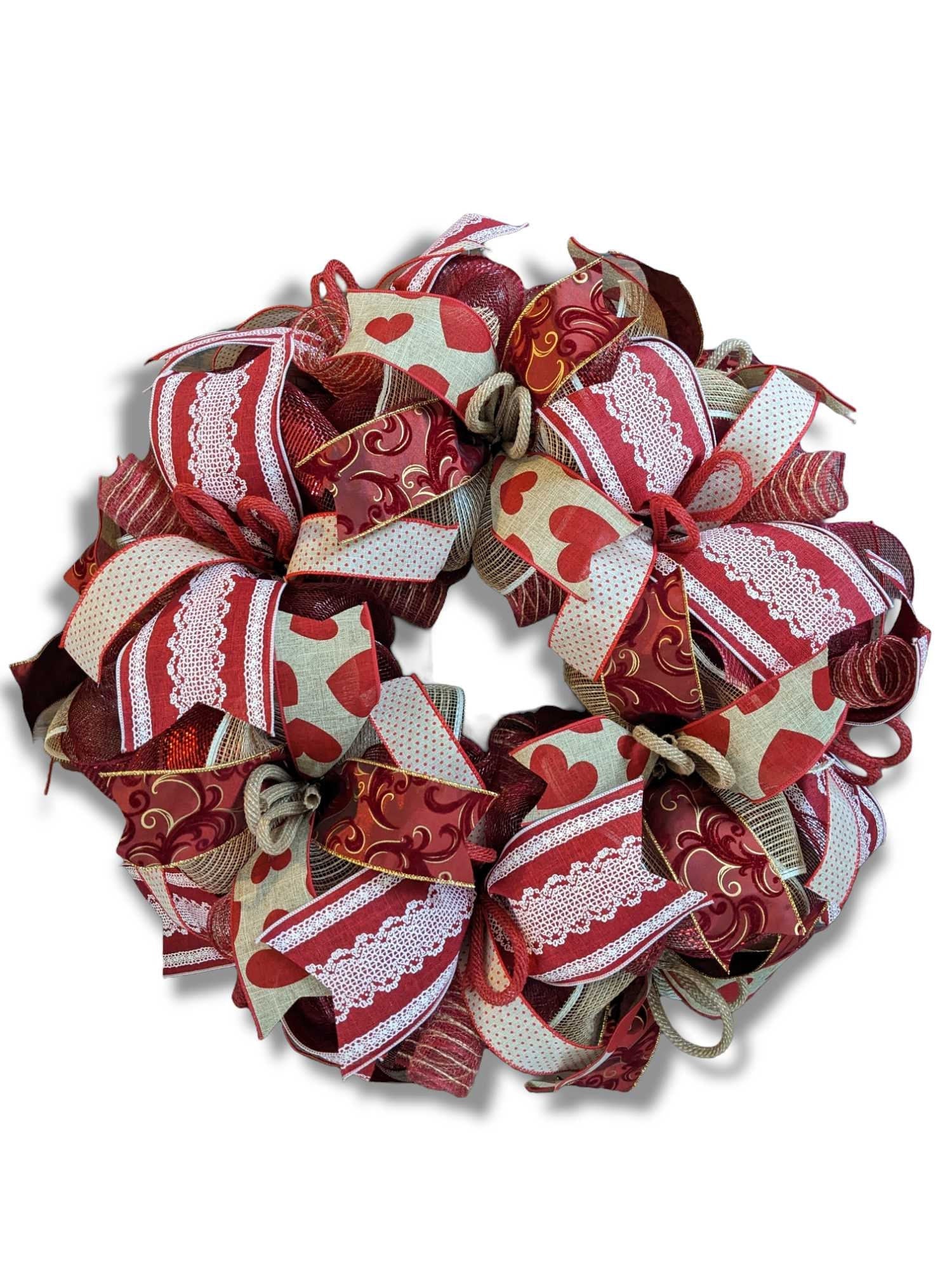 This Elegant 24x8 Valentines day wreath was created with a Burgundy deco mesh base with a red jute mesh twist accent and ruffling natural and cream jute mesh. This Piece is decorated in a lace 4" ribbon along with a gold and burgundy velvet scroll, natural Swiss polka dots and a natural and red heart ribbon. Inside this elegant item are loops of natural and red jute tubing giving this item a flowing feel to all it encompasses.