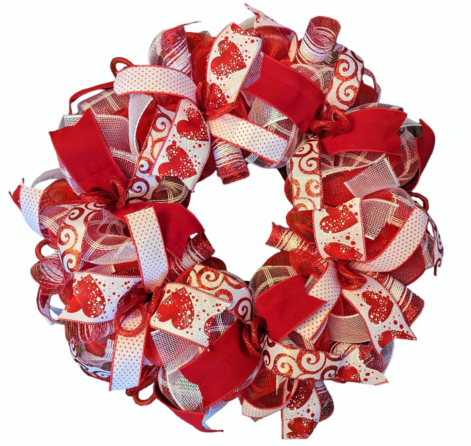 This 24x8 valentines day wreath was created with a red deco mesh base with red/white laser foil mesh and white mesh ribbon. This piece is decorated in a variety of hearts, scrolls, velvet and other Valentines day themed ribbon setting off all the love in this wreath!