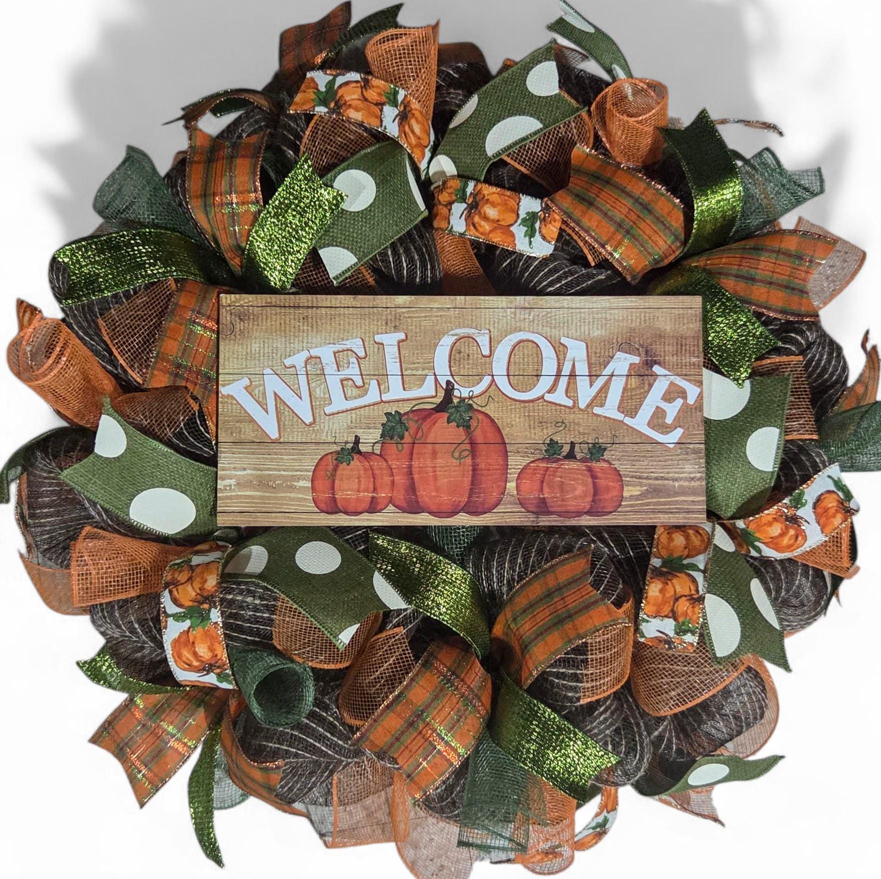 This fall filled 24" x 8" wreath was created on a chocolate jute mesh base and is covered in twists of green and orange!
