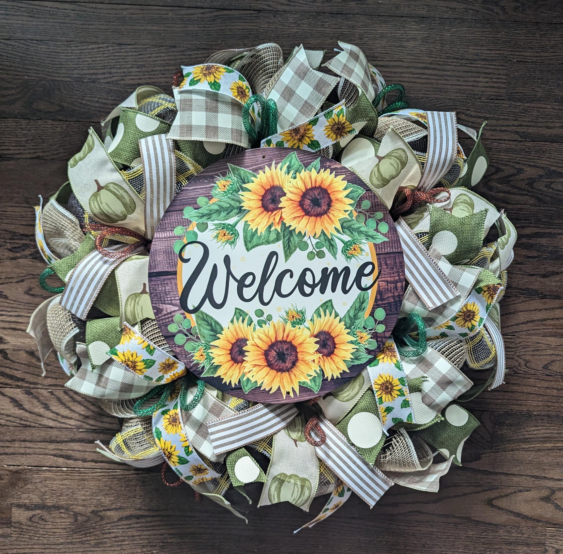 You will also find loops of green and chocolate mesh tubing surroung this fun and fall filled "welcome" sign,
